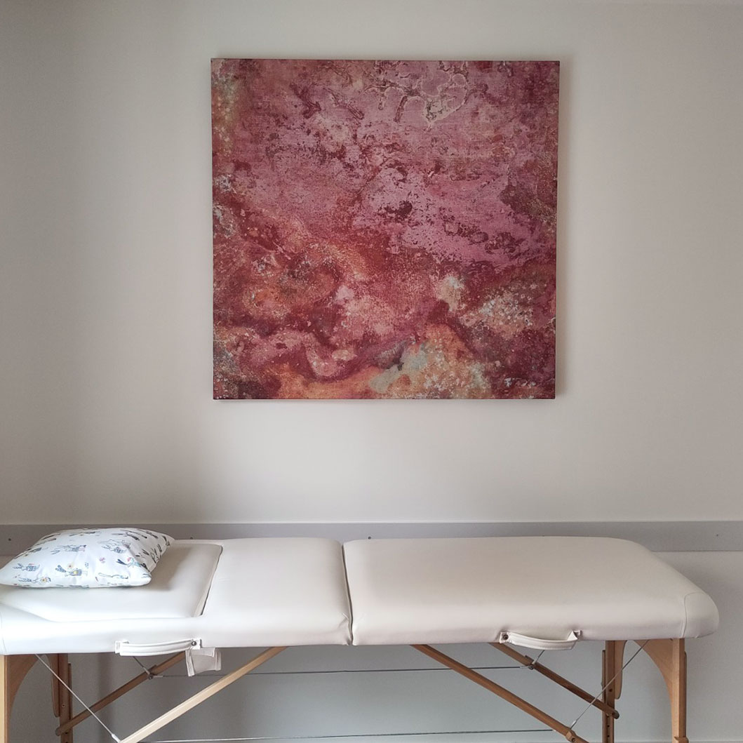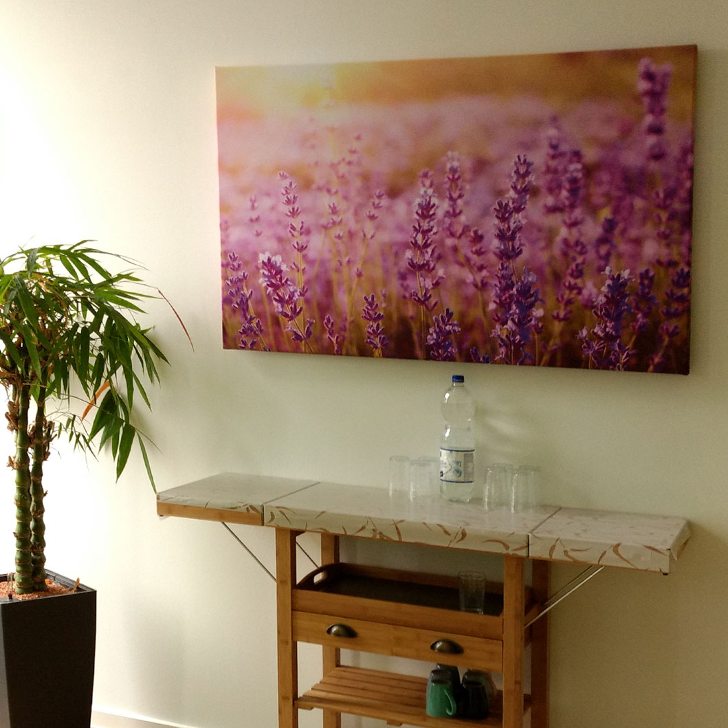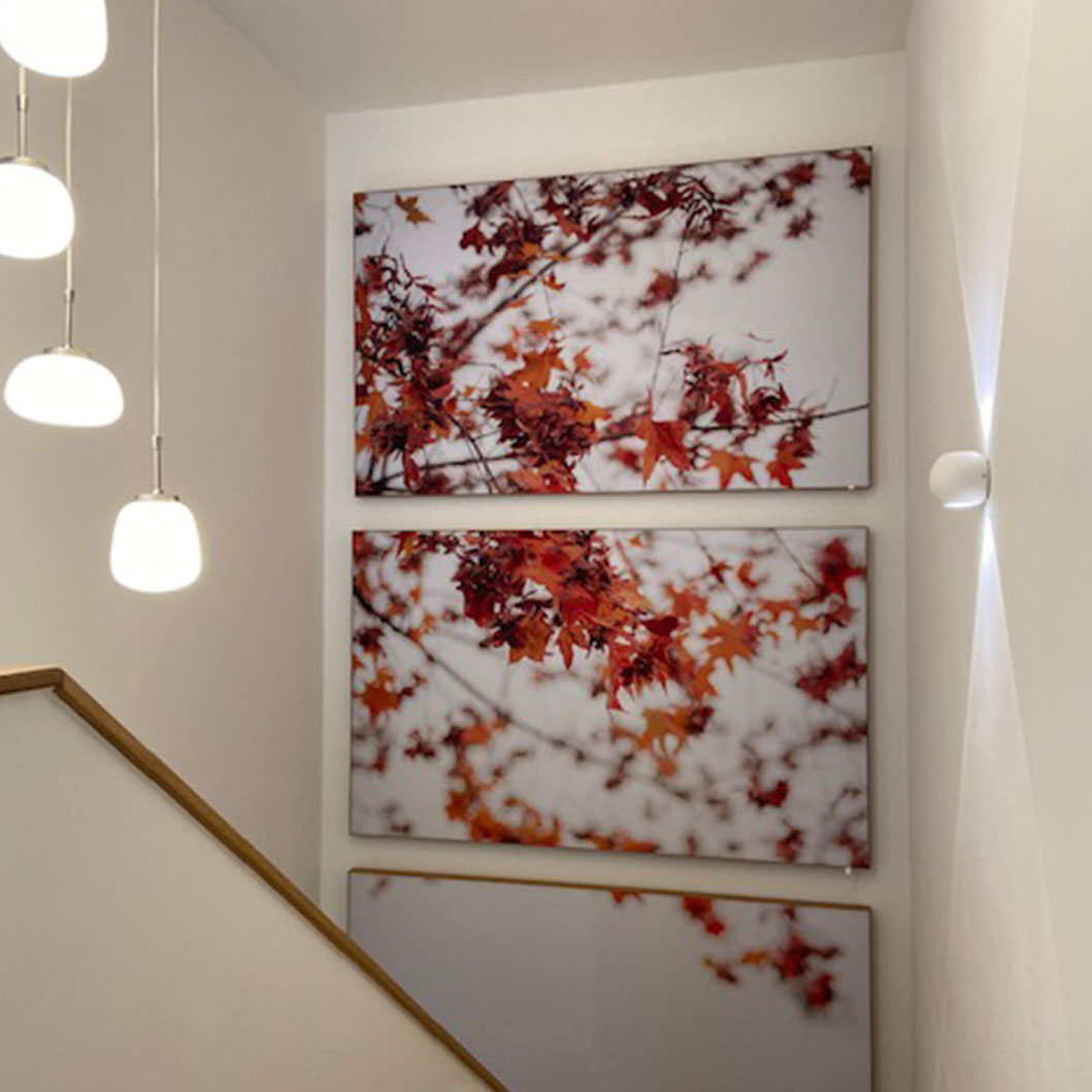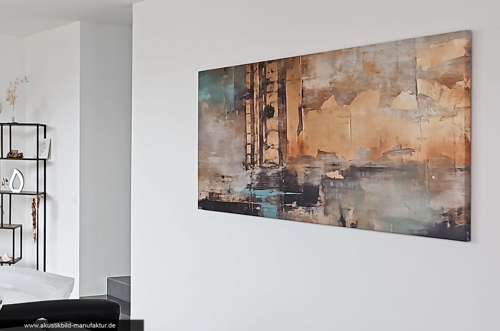 Größe & Position: Je nach Raum mindestens 2 m² Absorberfläche – zum Beispiel zwei Bilder à 120 × 80 cm an nebeneinanderliegenden Wänden. In langen Fluren sind wiederkehrende, kleinere Formate (z. B. 60 × 80 cm) ideal.