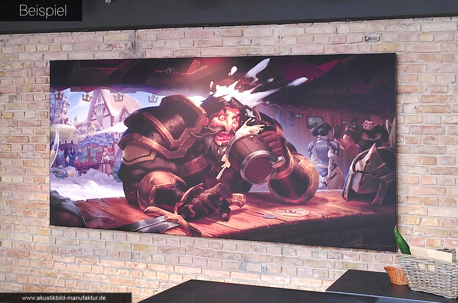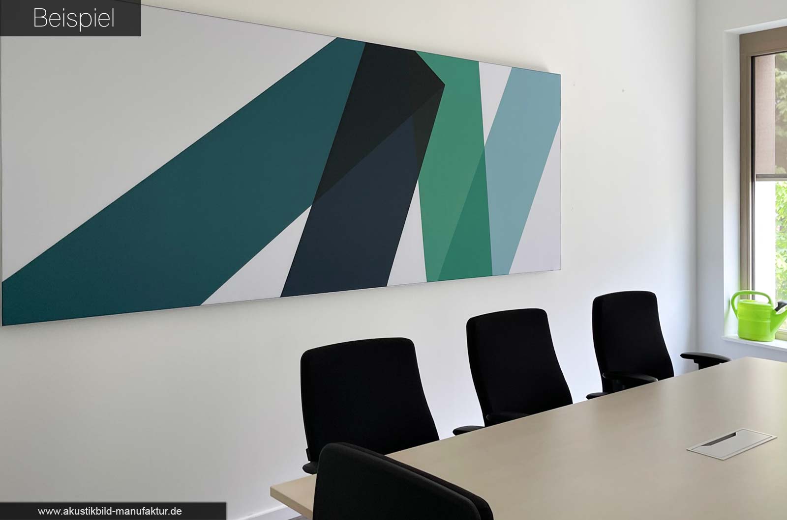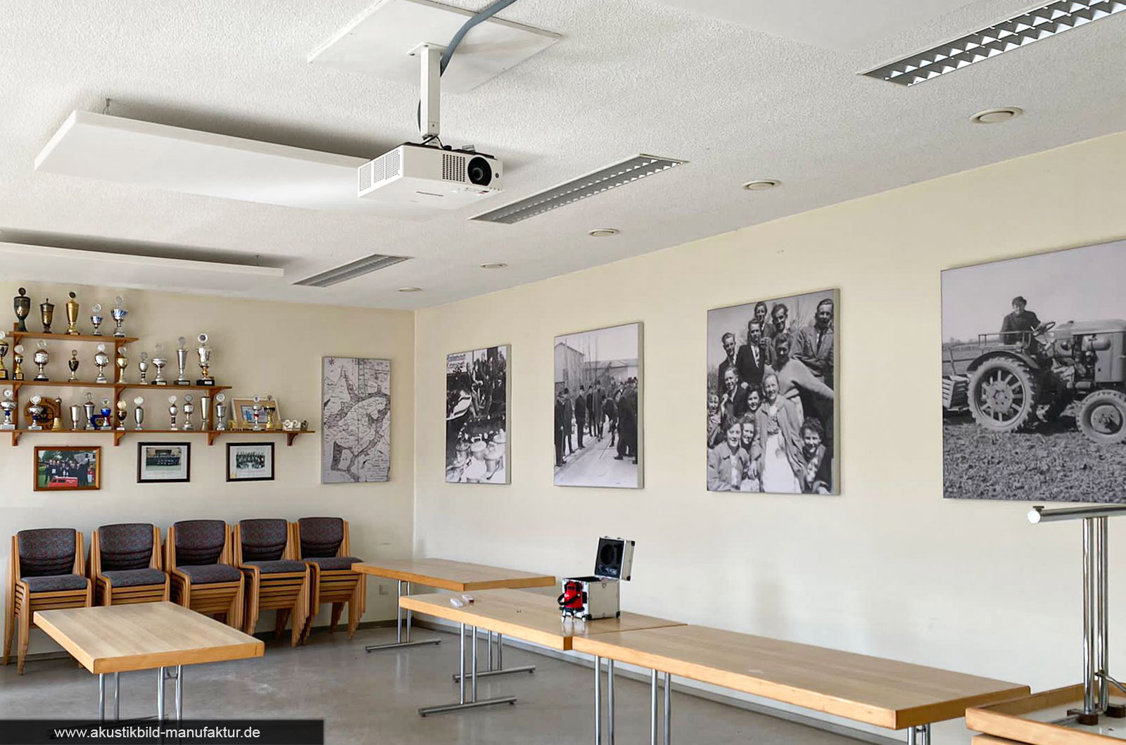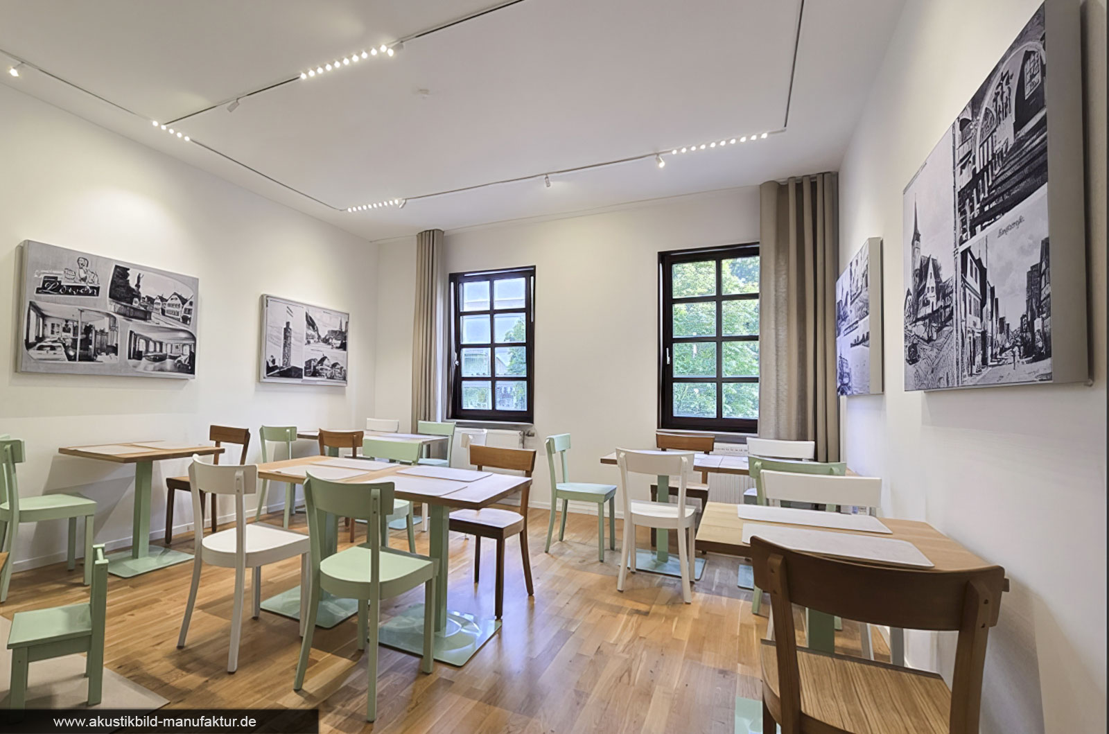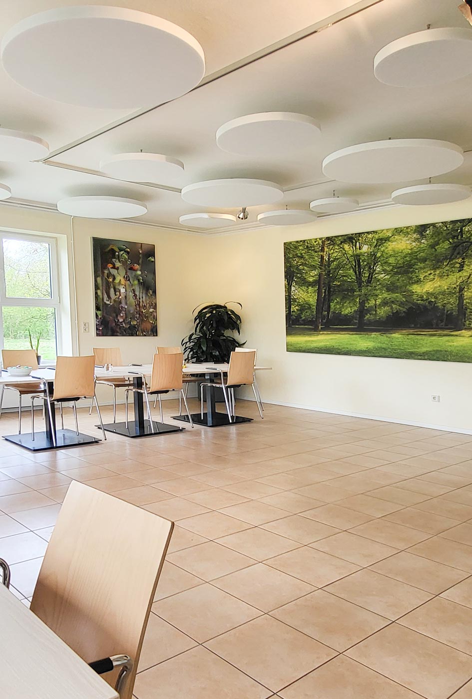 Größe & Position: Pro 4er-Tisch ca. 1,5 m² schallabsorbierende Fläche. Ideal: gleichmäßig an gegenüberliegenden Wänden oder als Serie an längeren Flächen. Bilder in 100 × 150 cm haben sich bewährt. Ergänzen Sie die Akustikbilder wenn möglich mit Deckenelementen!
