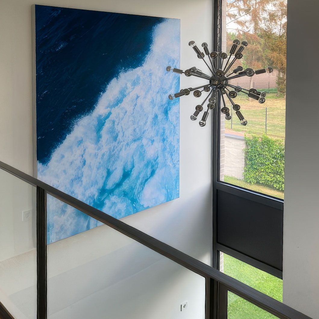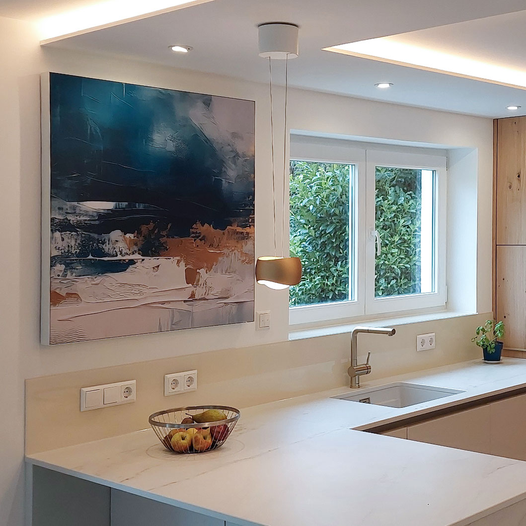 Größe & Position: Ein großes Querformat über dem Tisch (z. B. 150 × 100 cm) oder zwei kleinere Bilder (z. B. 80 × 80 cm links/rechts) sind ideal. Mindestens 1,5 m² Fläche bei offenem Grundriss.