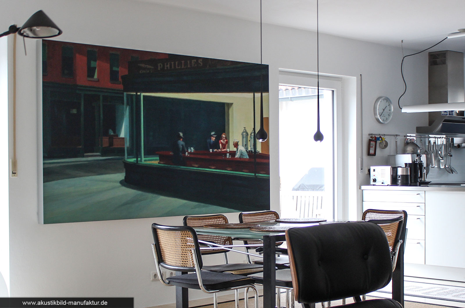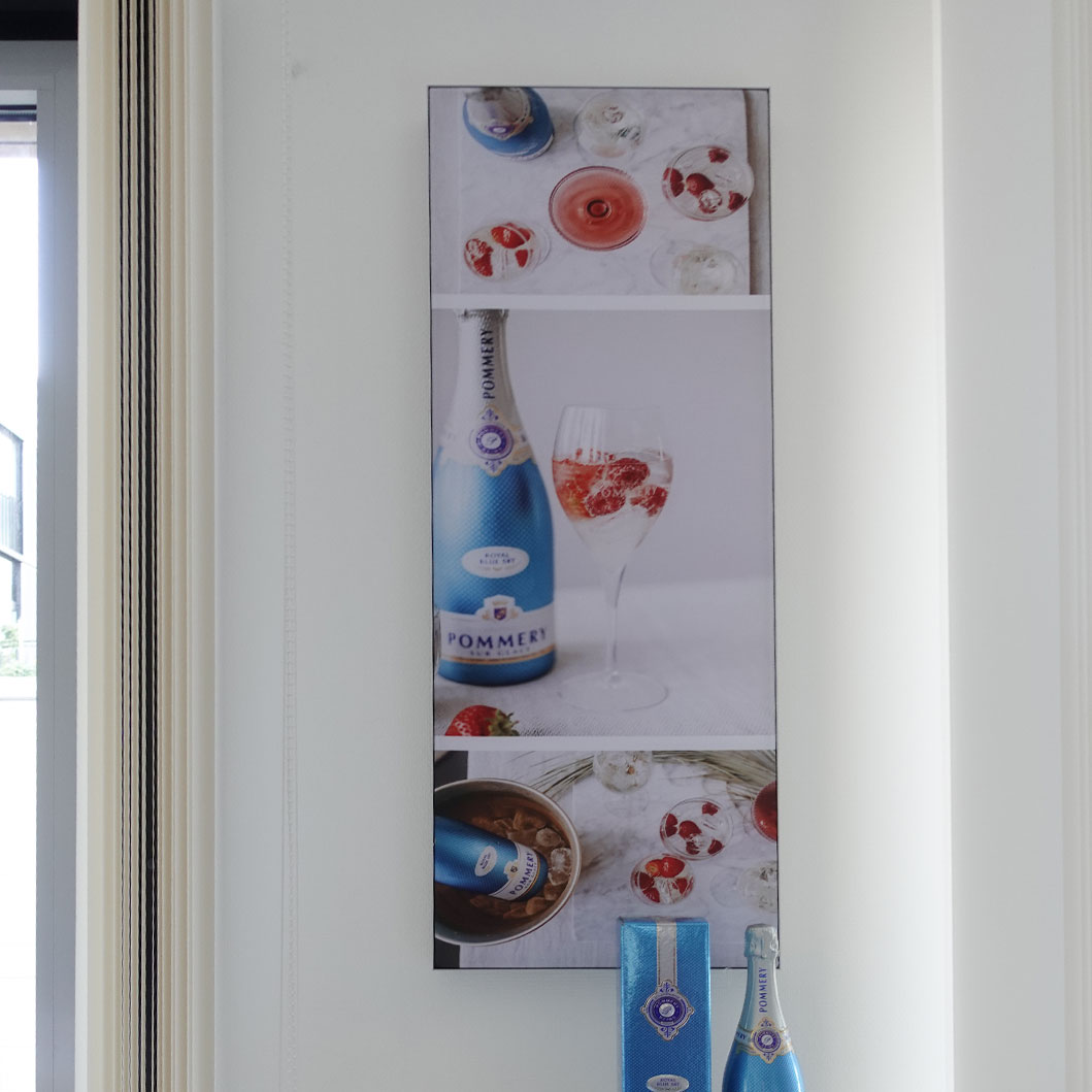 Größe & Position: Wichtig ist eine möglichst gleichmäßige Verteilung – z. B. pro 4er-Insel mindestens 1 großes Bild (150 × 100 cm) oder mehrere kleinere Bilder mit je 1–1,5 m² Fläche. Rückwände und Zwischenzonen sind ideale Flächen.