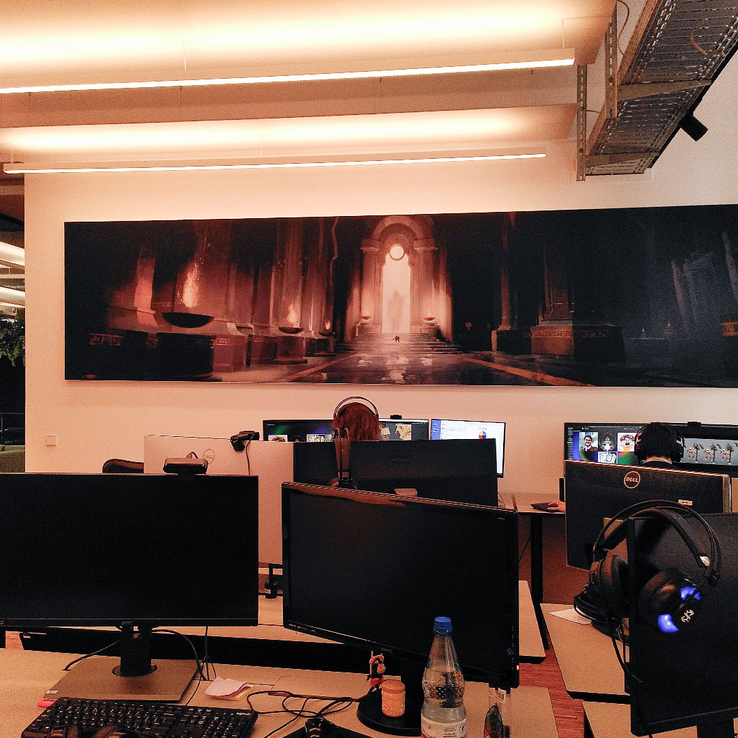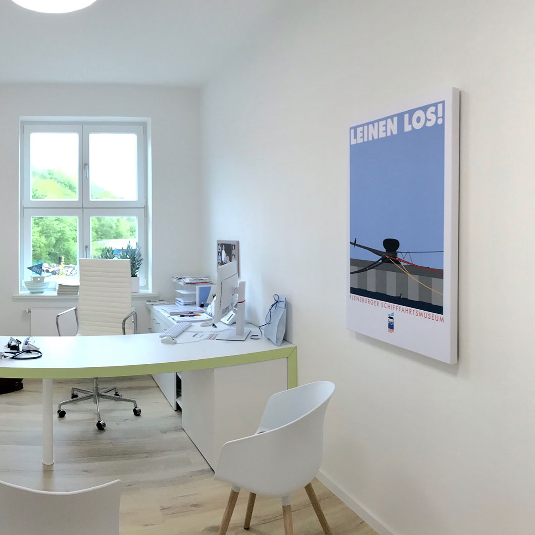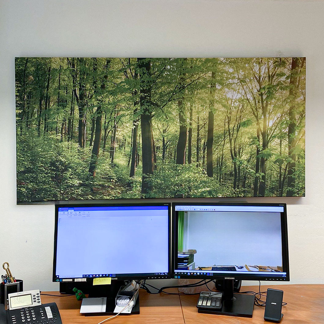 Designidee: In Einzel- oder Zweierbüros wirken ruhige, klare Motive besonders förderlich. Natur- oder Architekturszenen fördern die Konzentration und mindern Stress – wichtig bei hoher Denkleistung.