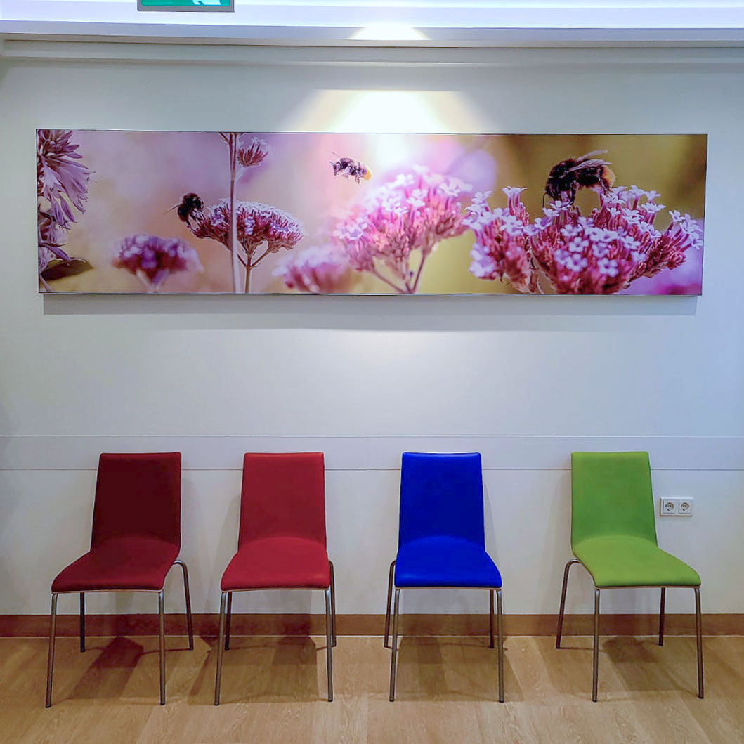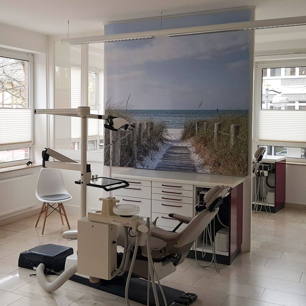 Designidee: Sanfte Farben, Naturmotive und abstrahierte Formen helfen, Anspannung zu lösen – vor allem im Wartebereich. In Bereichen für Kinder können Wimmelbilder eine schöne Variante zur Interaktion zwischen Eltern und Kindern sein, um Anspannung zu lösen. Im Behandlungszimmer fördern klare Bilder und Naturmotive ein Gefühl von Vertrauen. Anstrengende, kontrastreiche Designs vermeiden.