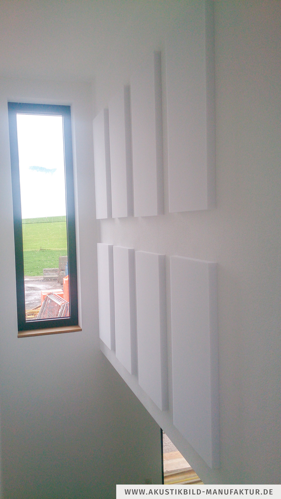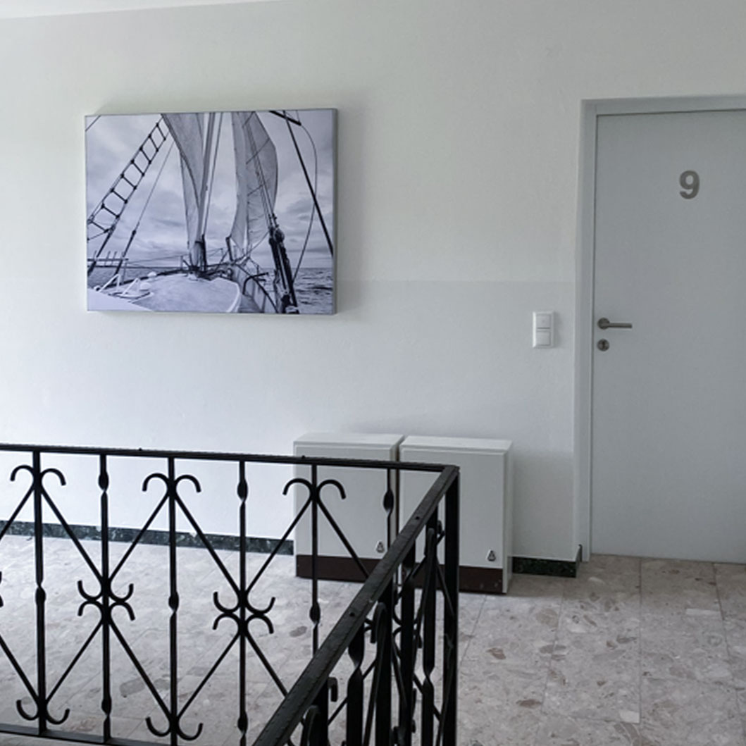 Je nach Ausführung und Design des Treppenhauses sind mehrere Varianten für Absorber denkbar – immer jedoch empfiehlt sich die Platzierung an der Wand bzw. einem Treppenauge und nicht an der Decke. Als Absorber können die puren Absorberplatten in weiß oder grau genutzt werden. Diese sind kostengünstig und sehr einfach zu montieren (fest verkleben, Klebepunkte oder auch aufhängen). Informationen und Fotos hierzu sowie die möglichen Formen und Preise finden Sie hier: → Schallabsorberplatten ohne Bezug Alternativ gibt es bei uns Akustikbilder. Diese sind teurer, dafür aber auch komplett nach Ihren Wünschen gestaltbar. Als Ausführungen gibt es einfarbige Akustikbilder, aber auch solche mit Motiv oder sogar Ihrem Wunschmotiv. Unsere Auswahl finden Sie hier: → Online-Shop Generell sind in unserer Manufaktur sind viert Arten von schallabsorbierenden Elementen erhältlich.Art 1: Akustikbilder im CanvasStyle ohne sichtbaren Rahmen mit einer Bautiefe von 4 cm.