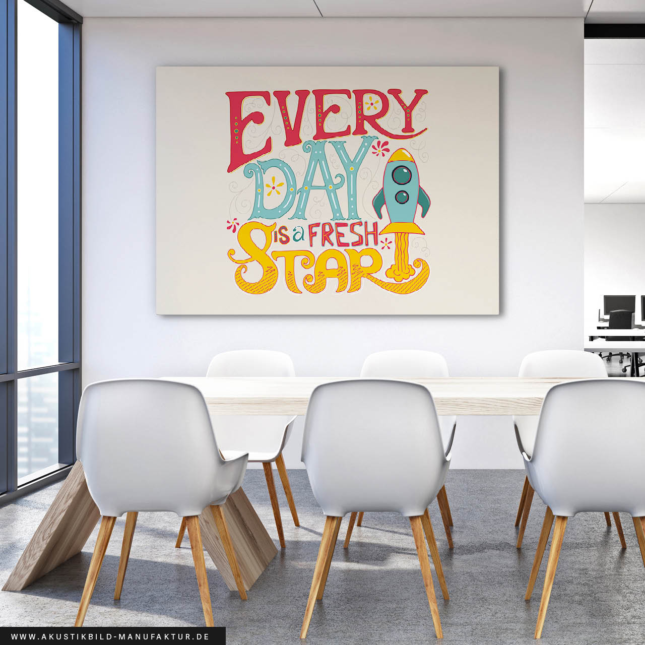 Am besten platzieren Sie das Akustikbild gegenüber oder hinter der Schallquelle. Typische Orte sind gegenüber oder hinter einem Schreib- oder Esstisch. Noch besser wirken mehrere Elemente an verschiedenen Wänden. Je besser die Platzierung, desto größer der Effekt – besonders, wenn nur ein Bild geplant ist.