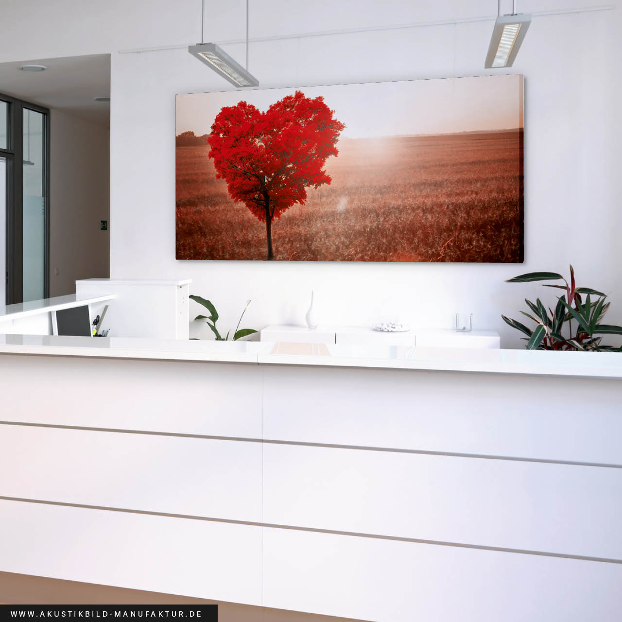 Am besten platzieren Sie das Akustikbild gegenüber oder hinter der Schallquelle. Typische Orte sind gegenüber oder hinter einem Schreib- oder Esstisch. Noch besser wirken mehrere Elemente an verschiedenen Wänden. Je besser die Platzierung, desto größer der Effekt – besonders, wenn nur ein Bild geplant ist.