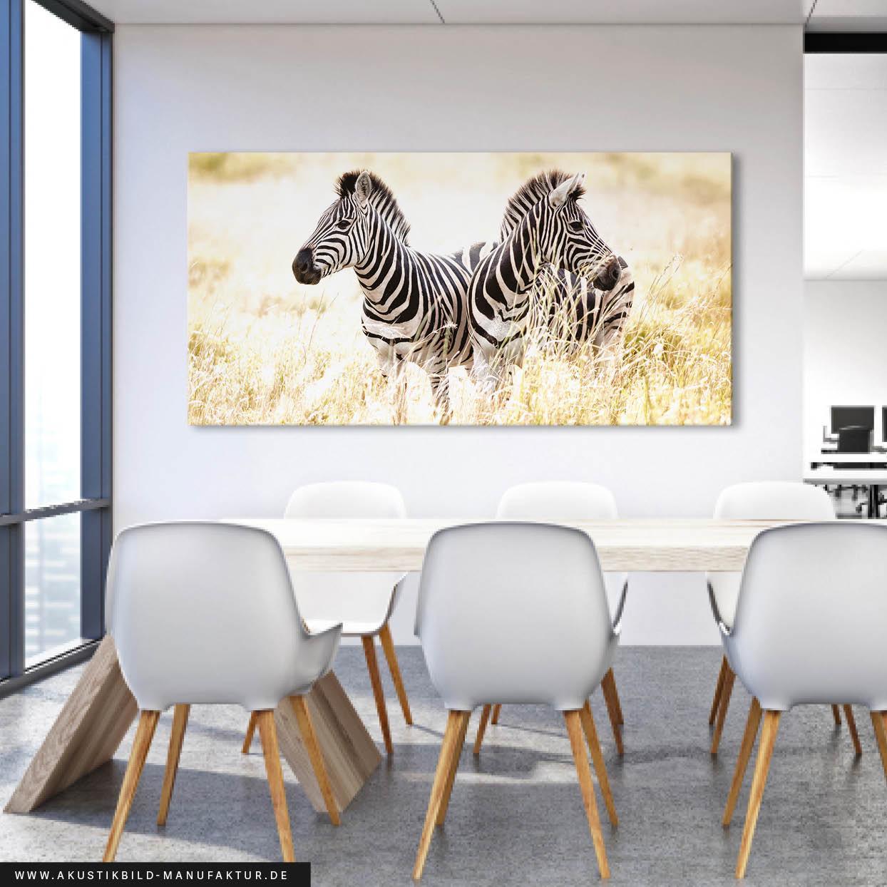 Am besten platzieren Sie das Akustikbild gegenüber oder hinter der Schallquelle. Typische Orte sind gegenüber oder hinter einem Schreib- oder Esstisch. Noch besser wirken mehrere Elemente an verschiedenen Wänden. Je besser die Platzierung, desto größer der Effekt – besonders, wenn nur ein Bild geplant ist.