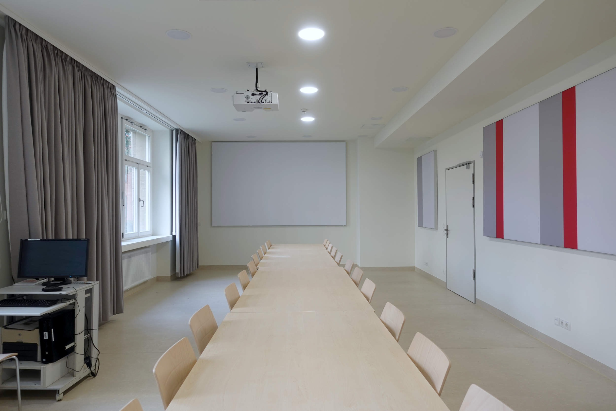 Diese Akustik-Projektionsfläche verbindet eine schalldämpfende Funktion mit der Nutzung der Wand für Projektionen. Sie verringert Nachhall und verbessert damit die Sprachverständlichkeit.