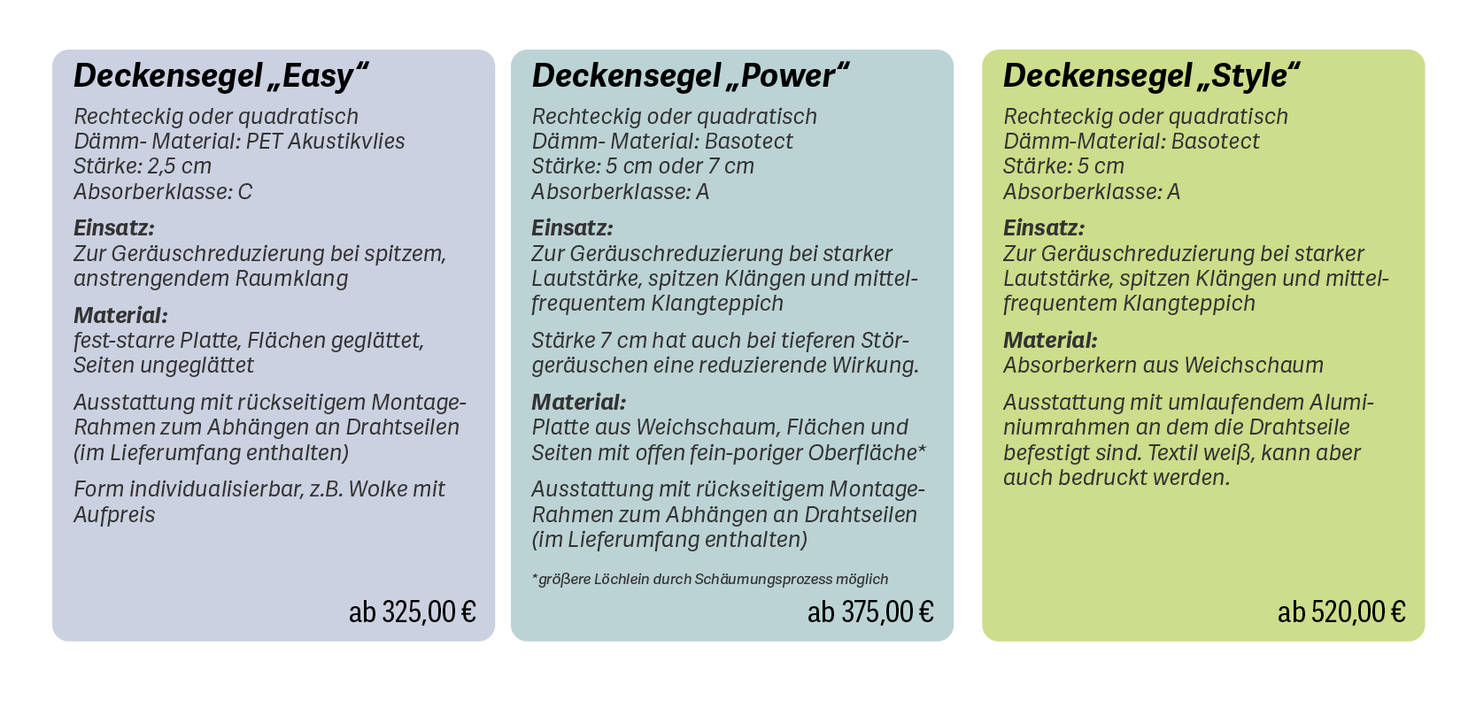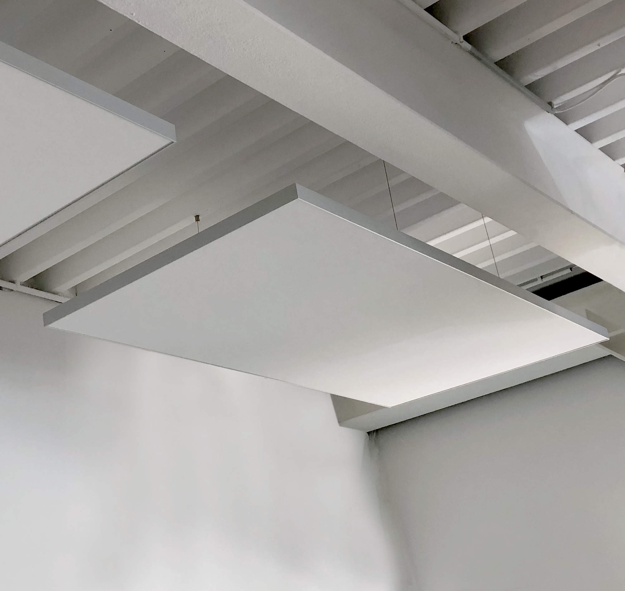 Das Deckensegel reduziert Nachhall in Räumen mit großer Raumhöhe (über 260 cm) und verbessert die allgemeine Unruhe im Raum deutlich
