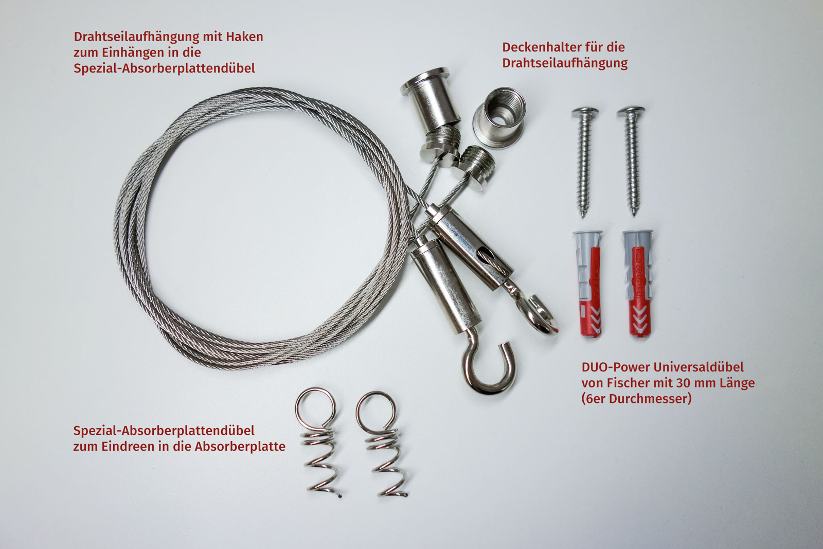 Zur Montage unserer Absorberplatten erhalten Sie von uns ein Drahtseil-Set in gewünschter Ausführung mit Spezialdübel für die Absorberplatten sowie Universaldübel (DUO-Power von Fischer 30mm/6mm) für die Decke.