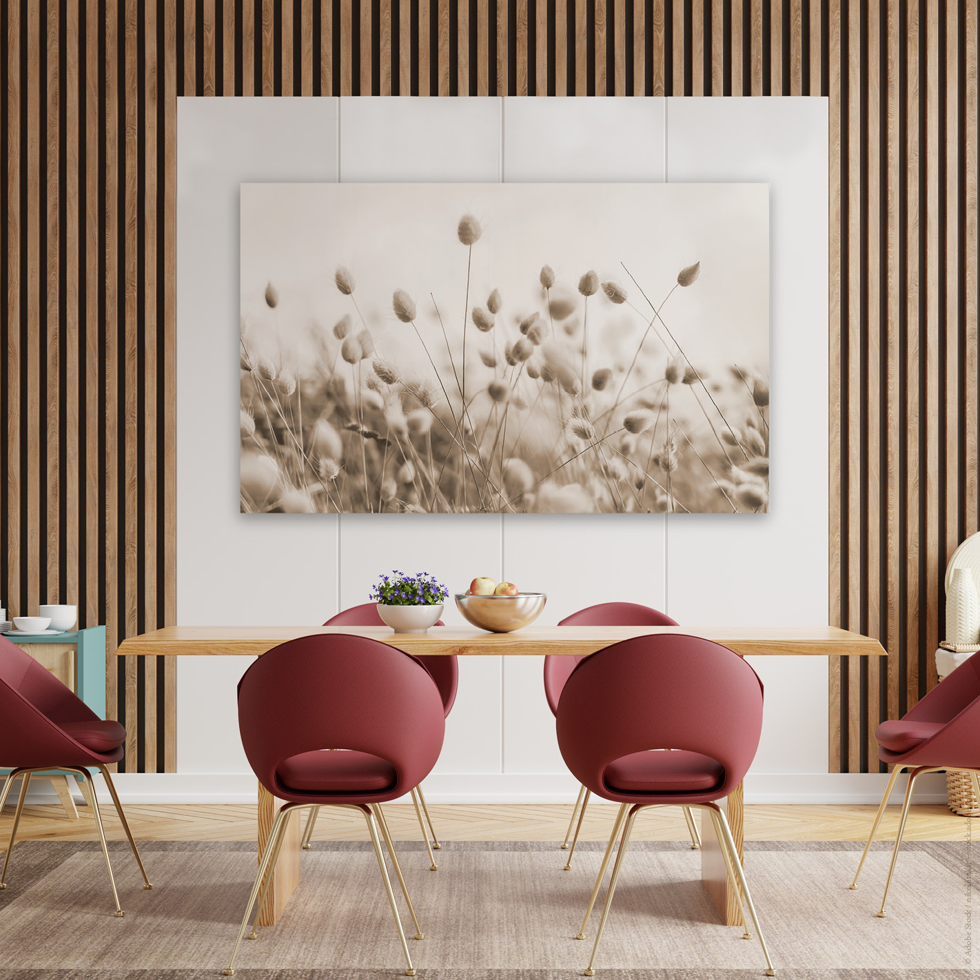 Am besten platzieren Sie das Akustikbild gegenüber oder hinter der Schallquelle. Typische Orte sind gegenüber oder hinter einem Schreib- oder Esstisch. Noch besser wirken mehrere Elemente an verschiedenen Wänden. Je besser die Platzierung, desto größer der Effekt – besonders, wenn nur ein Bild geplant ist.