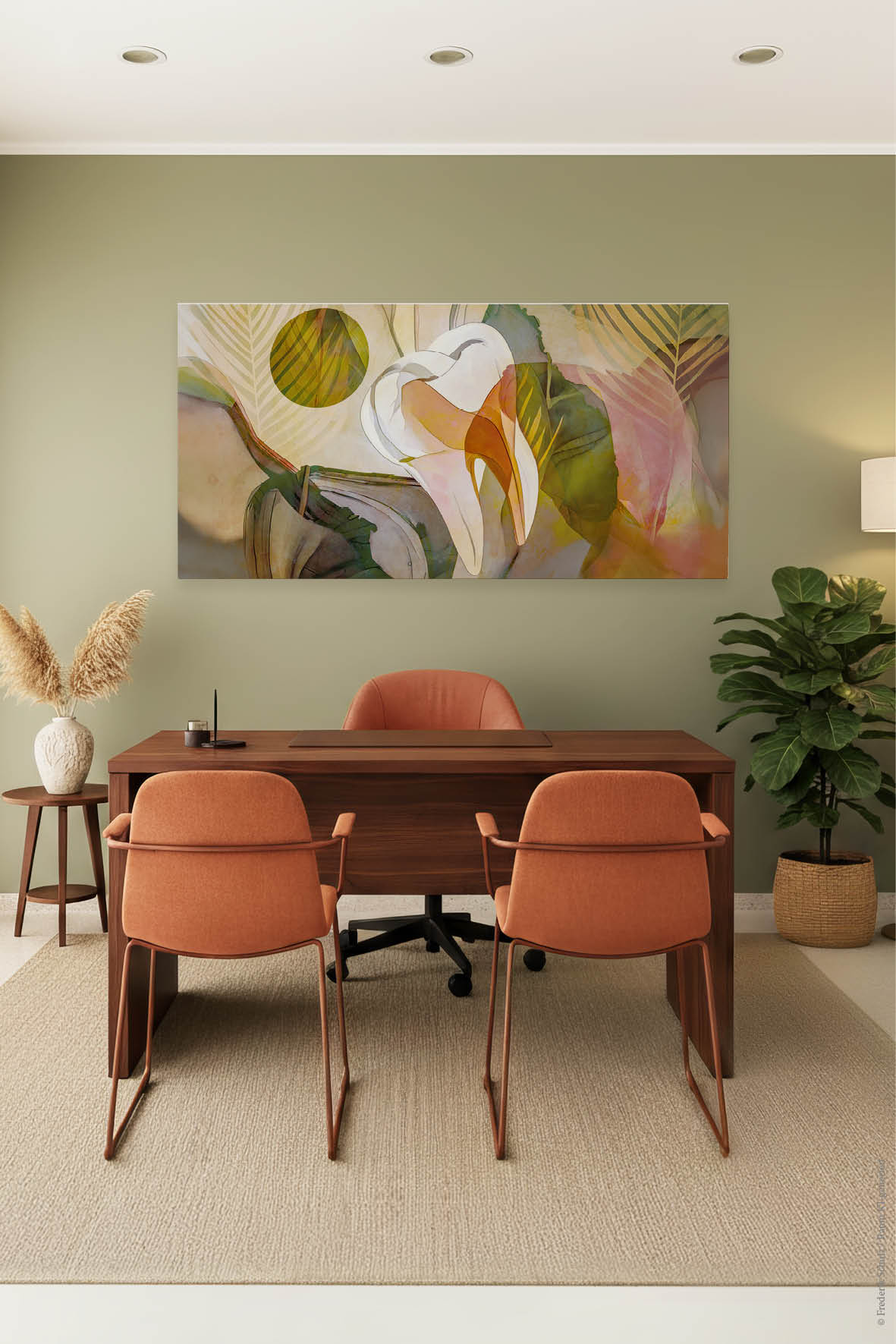 Am besten platzieren Sie das Akustikbild gegenüber oder hinter der Schallquelle. Typische Orte sind gegenüber oder hinter einem Schreib- oder Esstisch. Noch besser wirken mehrere Elemente an verschiedenen Wänden. Je besser die Platzierung, desto größer der Effekt – besonders, wenn nur ein Bild geplant ist.