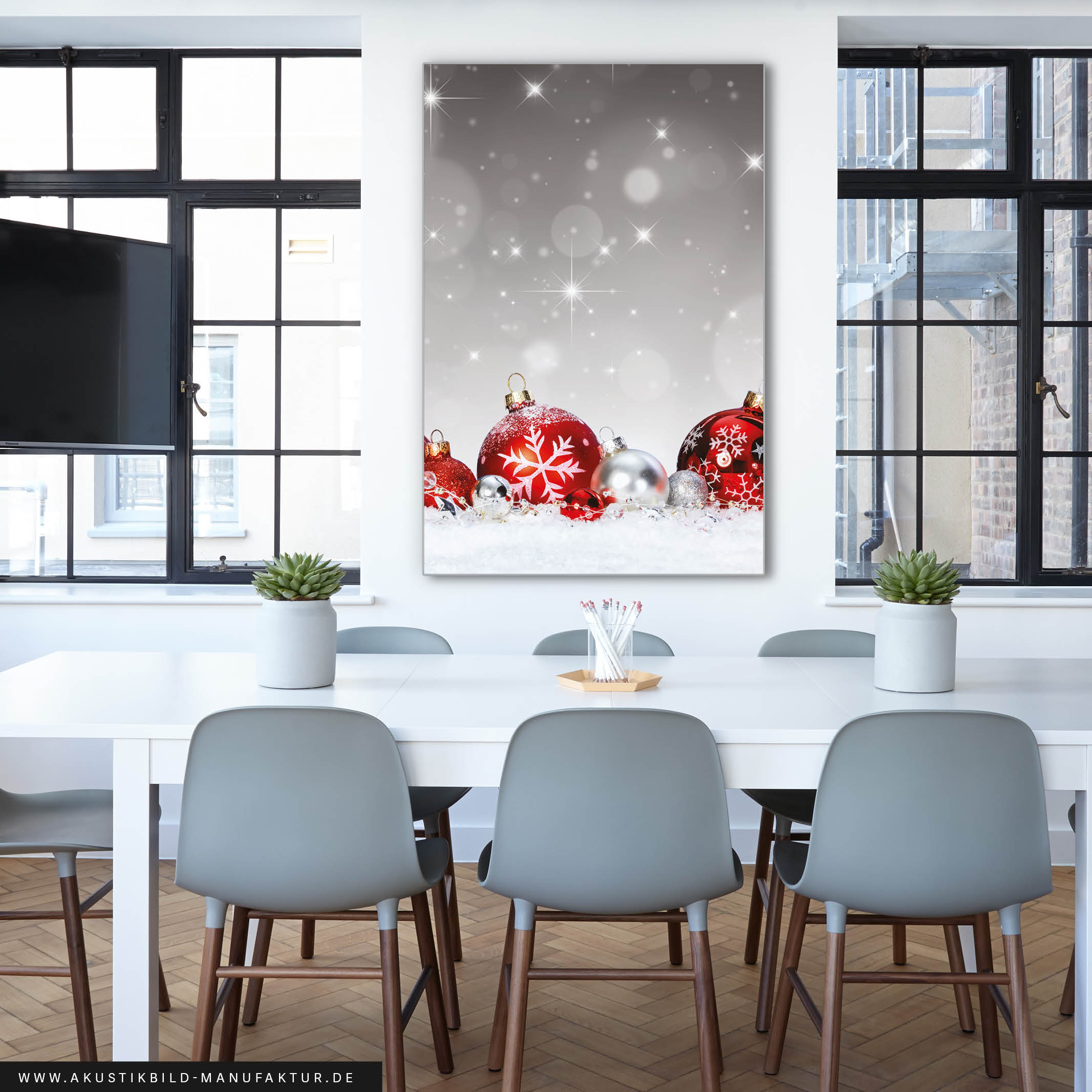 Am besten platzieren Sie das Akustikbild gegenüber oder hinter der Schallquelle. Typische Orte sind gegenüber oder hinter einem Schreib- oder Esstisch. Noch besser wirken mehrere Elemente an verschiedenen Wänden. Je besser die Platzierung, desto größer der Effekt – besonders, wenn nur ein Bild geplant ist.