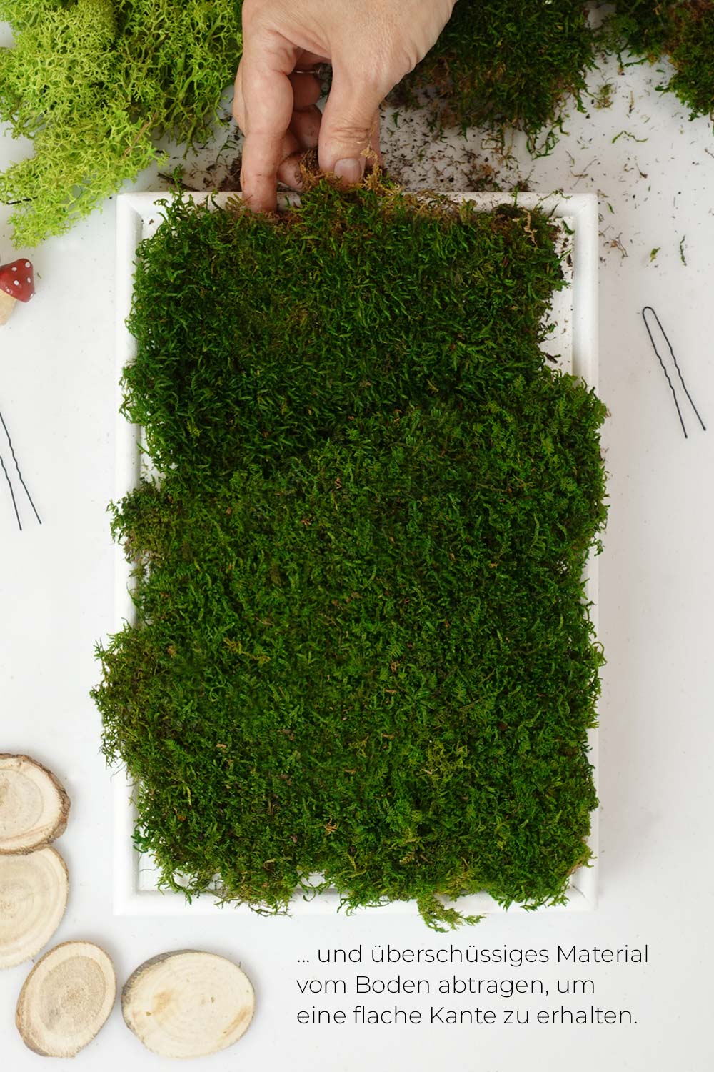 Wenn Sie mit der Höhe des Mooses am Rand Ihres Moosbild DIY nicht zufrieden sind, können Sie nun vorsichtig etwas vom Boden abtragen. Hierzu können Sie den Boden einfach vorsichtig abziehen bis die gewünschte Höhe erreicht ist.