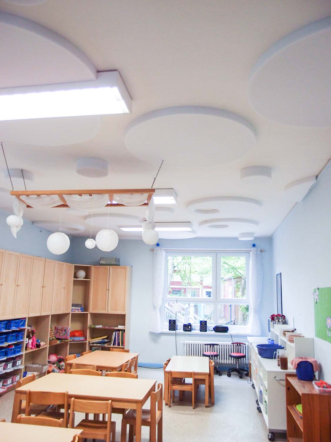 In Kindergärten sollten Akustikplatten in jedem Fall über den Tischen – am besten über die gesamte Decke verteilt angebracht werden. Einige Varianten finden Sie hier: Layoutvorschläge für die Decke
